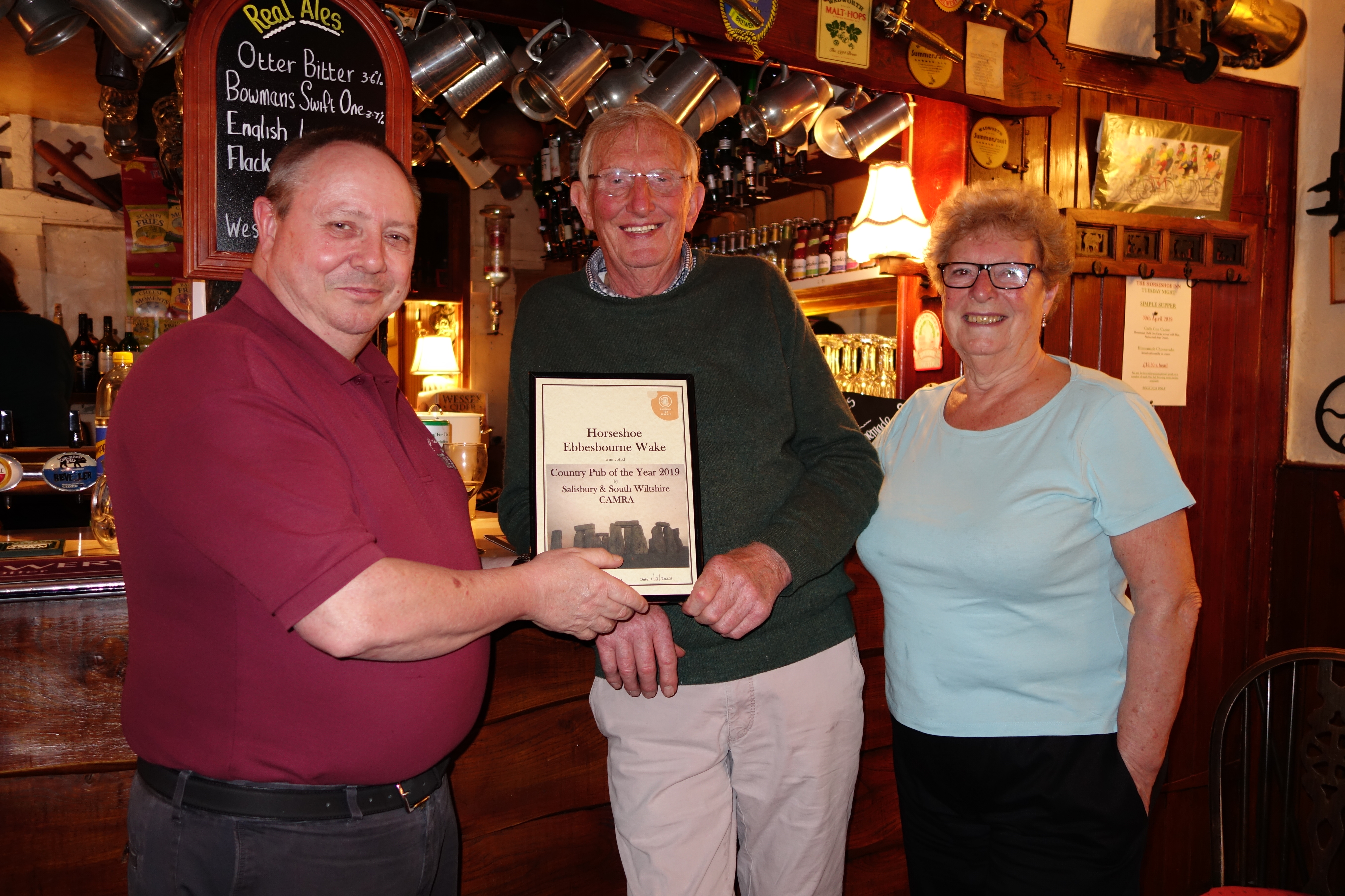 What a fabulous evening we had. The White Horse was busy, three beers on the bar: Whitstable Bay Pale Ale (Shepherd Neame), Shepherd Neame Spitfire Gold and Exmoor Ale; no complaints from anyone about quality. The Queen’s Head at Broadchalke had Badger Best & Fursty Ferret, the latter was very enjoyable (not suggesting anything wrong with the former but I didn’t try it!). The Crown at Alvediston was very quiet, only two people in before we took over! A good selection of ales: Prelude Pale & Hedge Hop from Flack Manor and 6d Best. All were excellent. Finally on to the Horseshoe at Ebbesbourne Wake. We presented Tony & Pat with their Country Pub of the Year award and we tucked into Otter Best, Bowman Swift One, Gritchies English Lore and Flack Manor Flack Catcher (I think I may have tried them all; well three of them!!). Highlight of the evening was Tony buying us all a drink in appreciation of his award; he was quite clearly delighted.